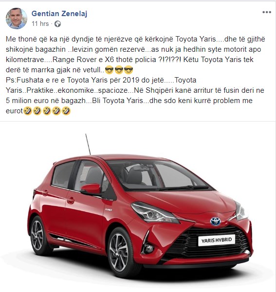 Aktori i humorit, Gentian Zenelaj, ka ironizuar me shumën rekord prej mbi 4 milionë euro të bllokuara një ditë më parë në Portin e Durrësit, të fshehura në dy makina tip Toyota Yaris. Në një postim në ‘Facebook’, aktori shkruan me ironi se ka një dyndje të njerëzve që kërkojnë Toyota Yaris, që sipas tij, ‘të marrka gjak në vetull’.