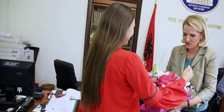 Ishte kjo e fundit, që u ngjit në zyrën ku do të zhvillohej mbledhja me një buqetë të madhe me lule, duke i bërë në mënyrë surprizë dhuratë Mimi Kodhelit, ndërsa ajo festonte sot 55-vjetorin.
