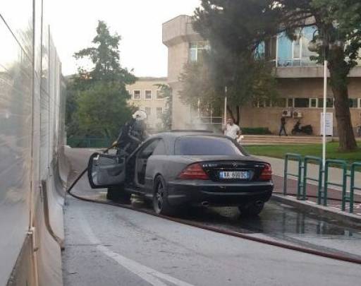 FOTO/ Një makinë ‘benz’ përfshihet nga flakët pranë stadiumit “Qemal Stafa”