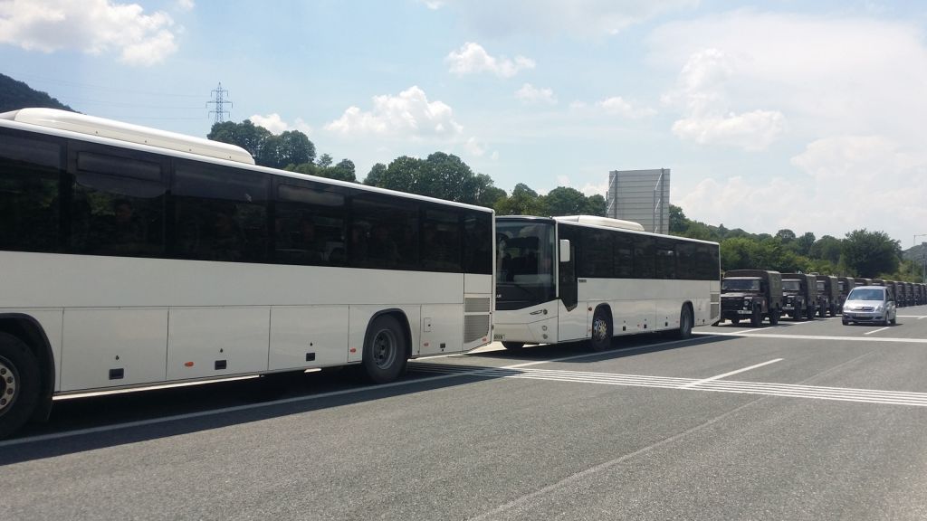 Sipas burimeve lokale, dy autobusë me ushtarë dhe 20 makina shoqëruese të tyre, që po udhëtojnë në kuadër të një stërvitjeje të NATO-s, të quajtur Noble Jump, janë bllokuar dhe nuk lejohen të kalojnë drejt kufirit.
