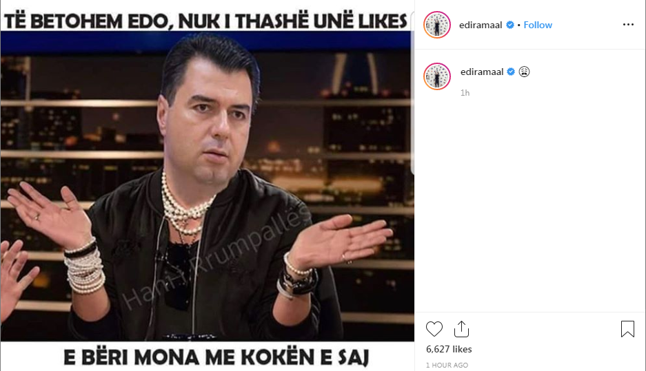 “Të betohem Edo nuk i thashë unë Likes, e bëri Mona me kokën e vet”- thuhet në një mem ku shfaqe kreu i PD Lulzim Basha.
