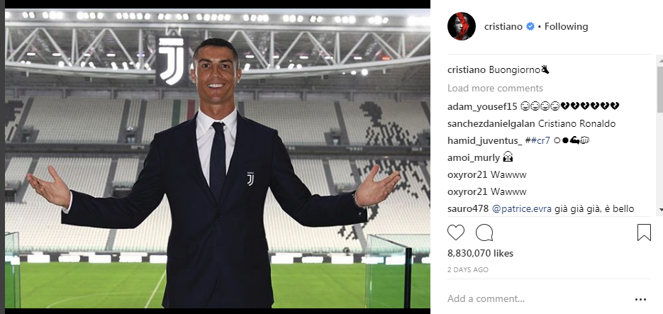 Futbollisti portugez, i cili për tre ditë më parë u zyrtarizua si futbollisti i Juventus është një nga më të ndjekurit në Instagram me mbi 136 milionë ndjekës.