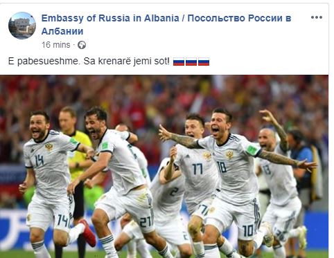 Ambasada e Rusisë në Tiranë ka reaguar pas fitores së kombëtares ruse përballë Spanjës në kuadër të kampionatit Botëror. Koha e rregullt përfundoi me rezultatin 1-1, por spanjollët janë mundur me penallti nga Rusia, vendi organizator i cili është kualifikuar për në çerekfinale. Ambasada ruse në Tiranë ka publikuar në Facebook një foto të kombëtares spanjolle duke festuar dhe shkruan në shqip: “E pabesueshme. Sa krenarë jemi sot! 🇷🇺 🇷🇺 🇷🇺”.