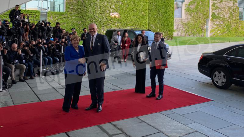 Ka nisur në Berlin takimi mes kryeministrit shqiptar Edi Rama dhe kancelares gjermane, Angela Merkel. I pranishëm në këtë takim është edhe kryeministri i Maqedonisë së Veriut, Zoran Zaev. Nga sa mund të dallohet edhe në foto, kryeministri Edi Rama shoqërohet nga ministri i Jashtëm në detyrë, Gent Cakaj, ministrja e Marrëdhënieve me Parlamentit, Elisa Spiropali.