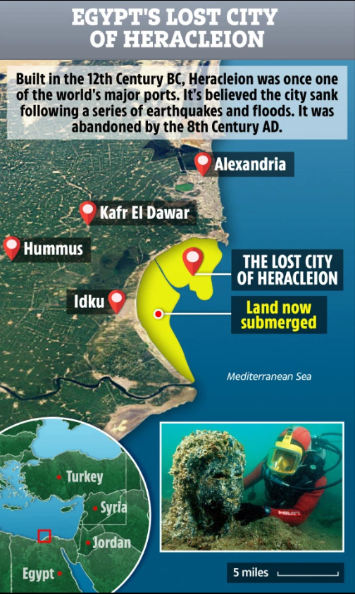 Herakleioni, në brigjet veriore të Egjiptit, u mbulua nga deti rreth 1,200 vjet më parë dhe humbi për shekuj me radhë derisa zhytësit gjetën atë që ka mbetur prej tij.