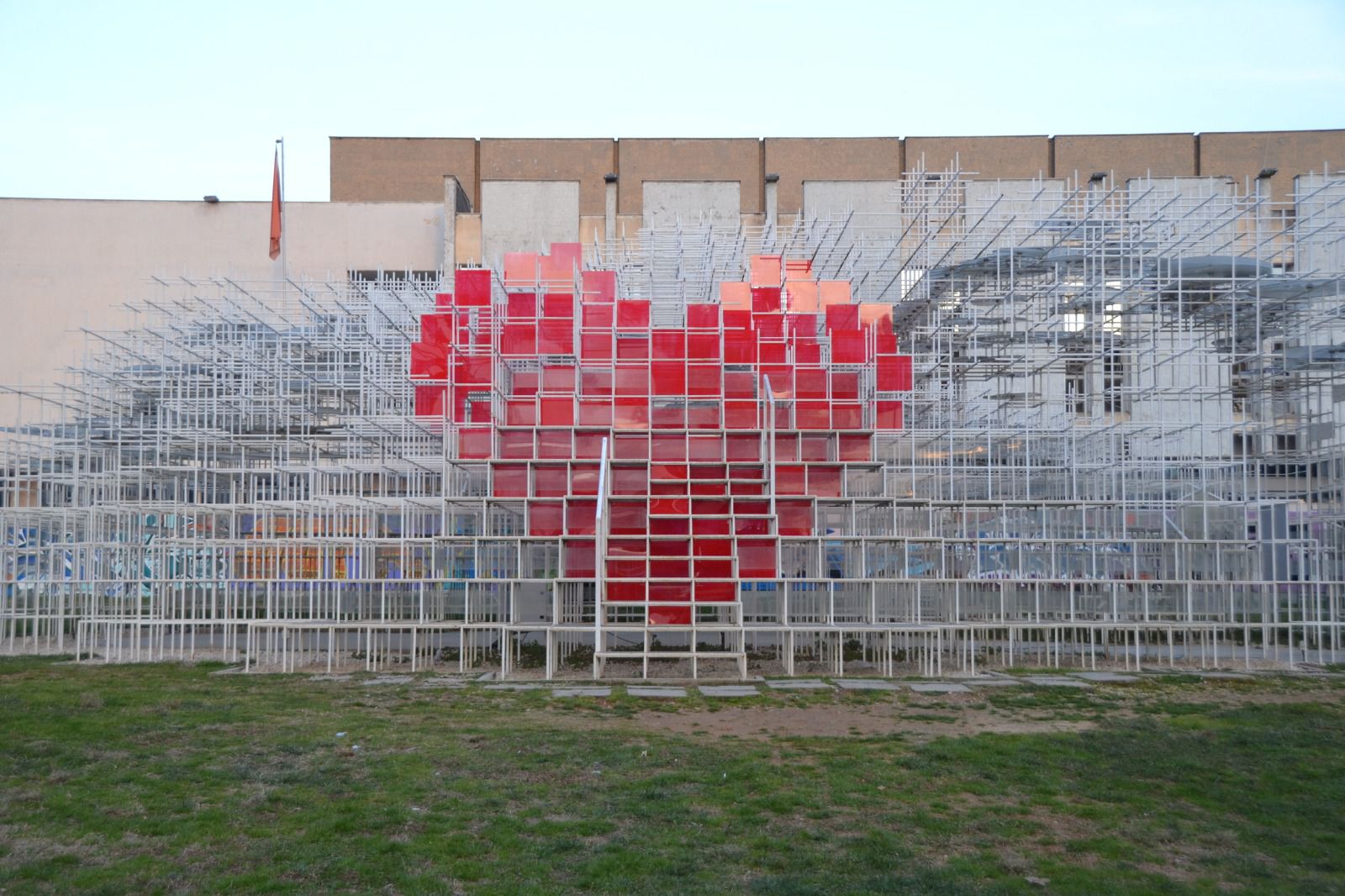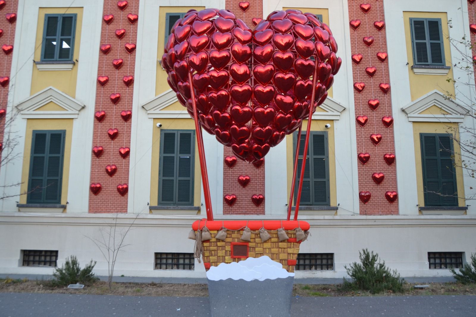 Një balonë gjigande me zemra ndodhet përpara Bashkisë, ndërkohë që ato kanë “pushtuar” pothuajse gjithë fasadën.