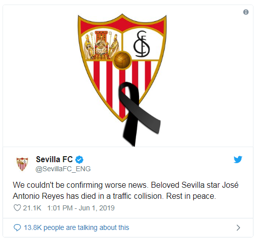 Spanjolli 35-vjeçar, i cili po luante për ekipin e Divizionit të Dytë, Extremadura, nuk i ka mbijetuar dot aksidentit tragjik të sotëm. Ish-klubi i tij, Sevilla, shkroi i pari: “Nuk mund të konfirmonim lajme më të këqija se ky; ylli i dashur i Sevilla, José Antonio Reyes, ka vdekur në një aksident automobilistik. Reyes ishte lojtari më i ri në historinë e Sevilla, që bëri debutimin me klubin tonë në moshën vetëm 16-vjeçare”.
