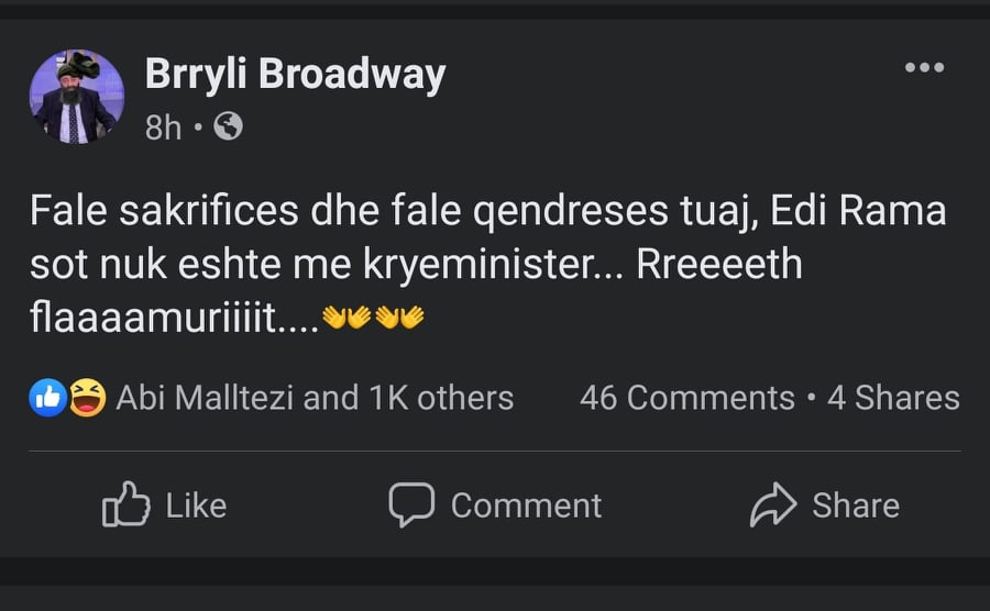 “Falë sakrificës dhe falë qëndresës tuaj, Edi Rama sot nuk është më kryeministër….Rreeeeth flaaamuriiiit….”, shkruhet në statusin që duket se i bëri përshtypje Malltezit, duke i dhënë edhe një pëlqim.