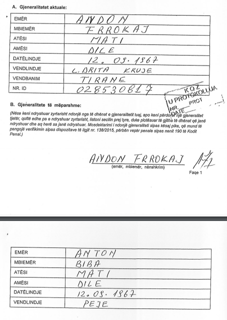Kështu, ai garon nën emrin Andon Frrokaj me vendlindje në Krujë. Mirëpo, më parë deklaron se e ka patur emrin Anton Biba me vendlindje në Pejë të Kosovës, shkruan “Panorama”.