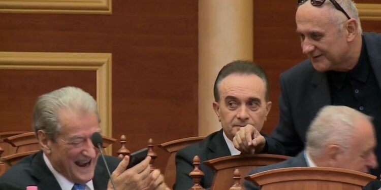 Një moment pikant është kapur nga kamerat kur deputeti i Partisë së Lirisë, Petrit Vasili i ka treguar diçka nga telefoni i tij, Sali Berishës.