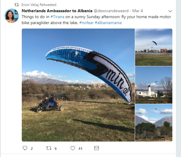 Tirana po kthehet një destinacion tepër të pëlqyer për turistët e huaj dhe një pikë ku turistët qëndrojnë me dëshirë sapo mbërrijnë në Shqipëri duke shijuar gatimin, por dhe natyrën e mrekullueshme. E ambasadorët më të mirë, duket se janë vetë përfaqësuesit diplomatikë të akredituar në vendin tonë të cilët kanë mundësi gjatë qëndrimit në detyrë që të faktojnë thesarin që fsheh kryeqyteti shqiptar. Sikurse në shumë nisma të tjera, një nga lobueset më të zëshme është ambasadorja e Hollandës, Van de Ëeerd, e cila ka postuar disa foto nga një pasdite në Tiranë. “Gjëra duhet të bëni në Tiranë në një të dielë pasdite me diell: Fluturo në ajër me parashutën tënde artizanale me motor mbi liqen. #pa frikë# maniashqiptare”, shkruan diplomatja hollandeze në vendin tonë e cila njihet për pasionin e saj për natyrën.