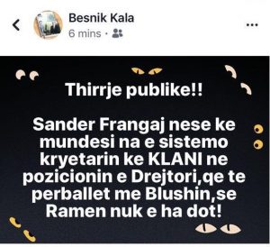 Sander Frangaj nese ke mundësi na e sistemo kryetarin te Klani në pozicionin e Drejtorit, që të përballet me Blushin, se Ramen nuk e ha dot.” /ma.me