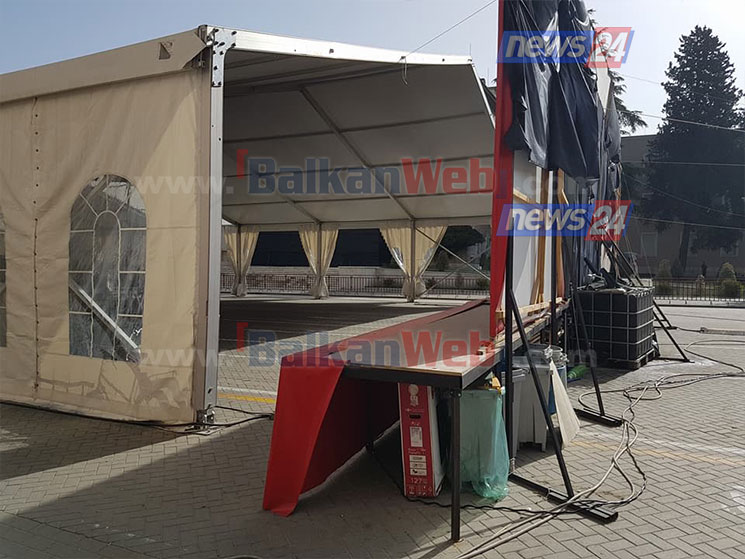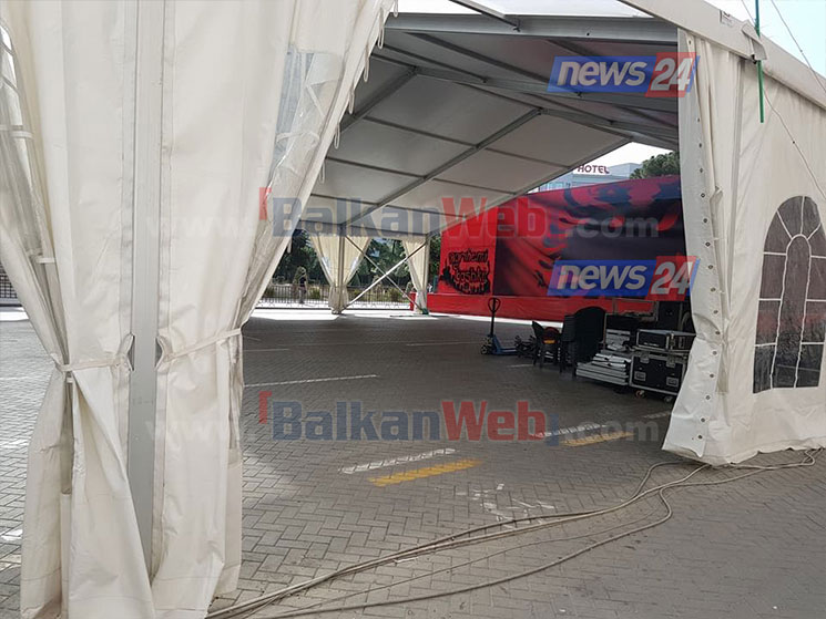 Të gjitha karriget, stola, tavolinat, podiumi dhe objekte të ndryshme janë nxjerrë nga çadra…