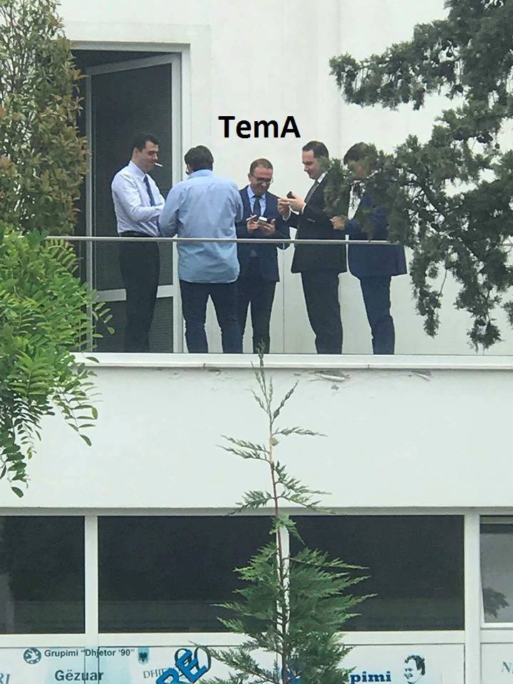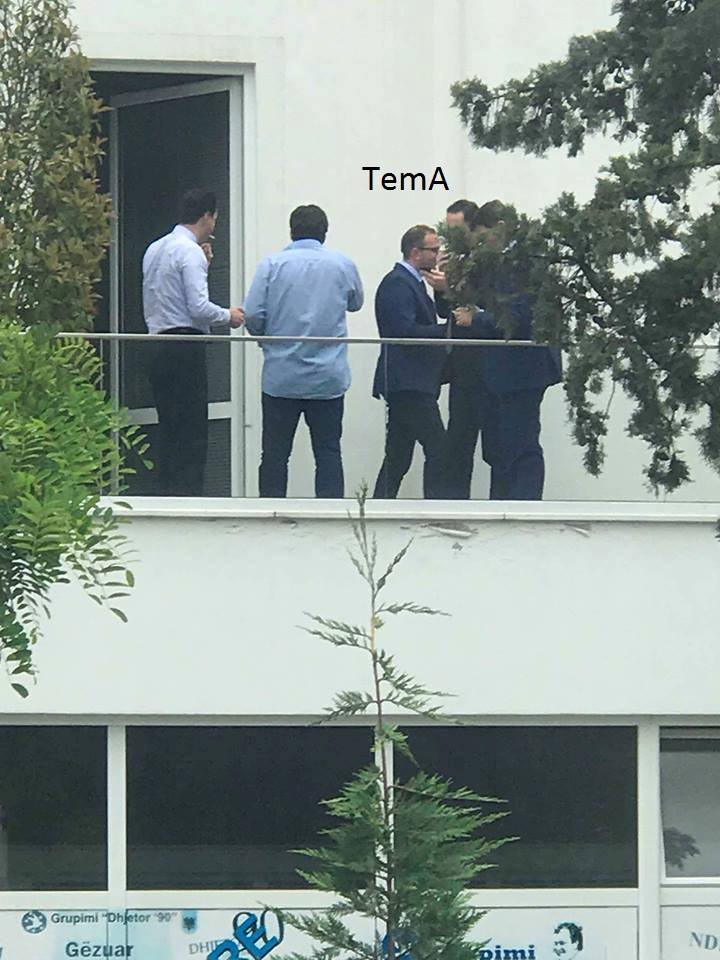 Kryetari i Partisë Demokratike Lulzim Basha është fotografuar në ballkonin e selisë blu me bashkëpunëtorët e tij të afërt.