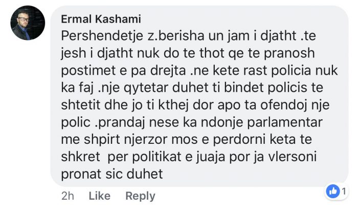 Përmes një komunikimi në rrjetin social Facebook, Berisha shprehet se policët treguan kafshëri gjatë ushtrimit të detyrës së tyre edhe pse te lenduar ne proteste mbeten 13 police te cilet ndenjen me duar ne xhepa duke mos reaguar kundrejt sulmit te turmes.