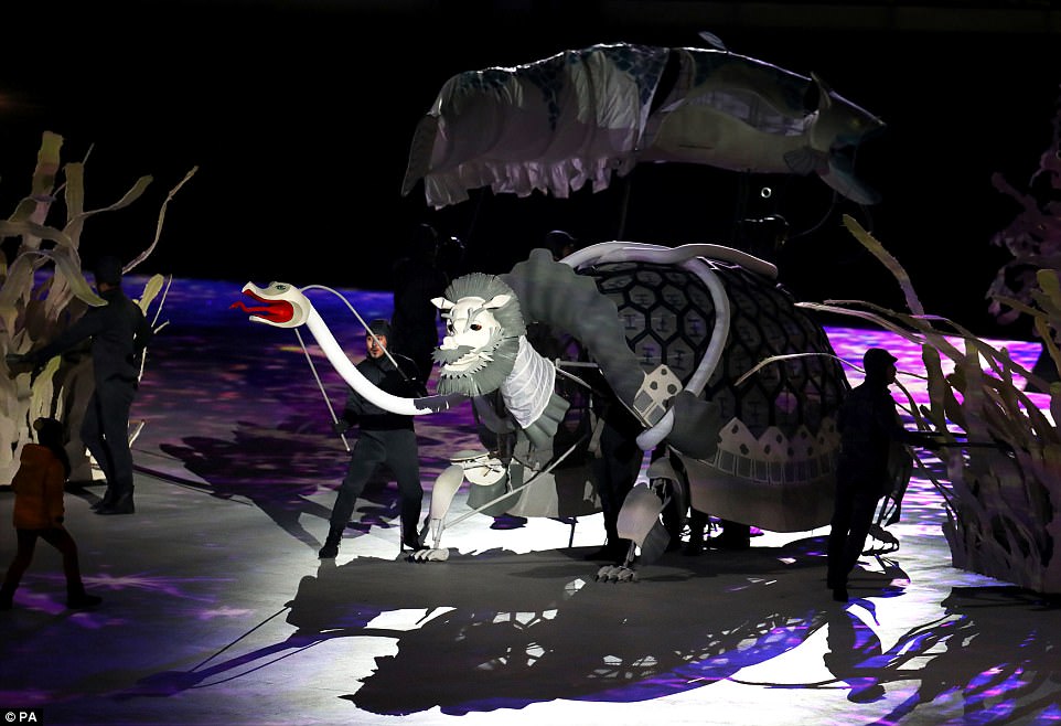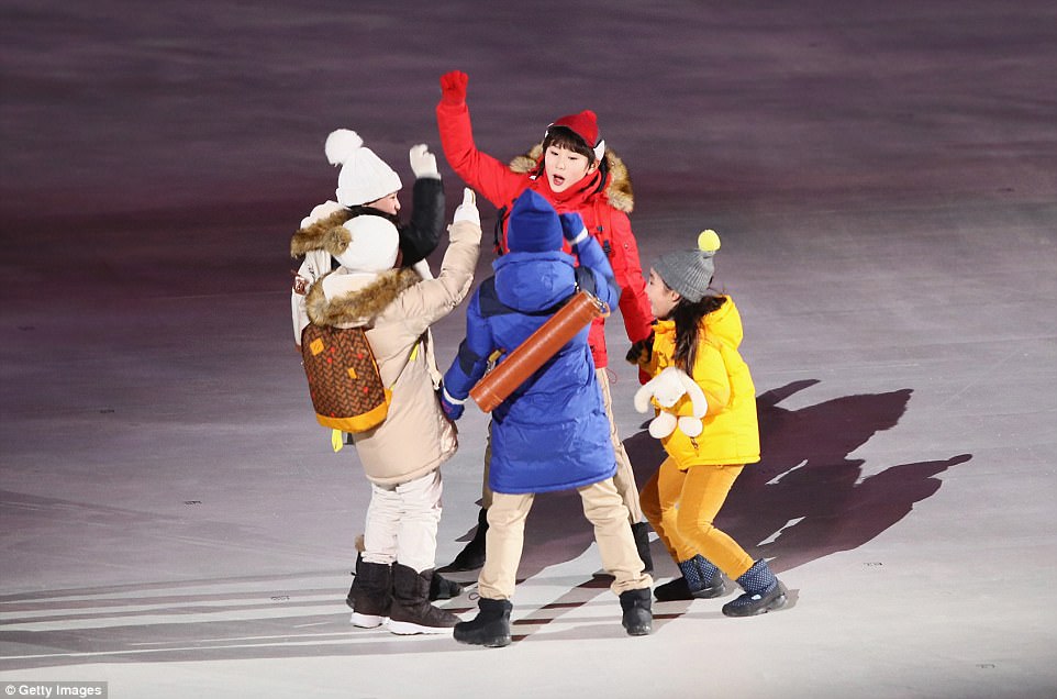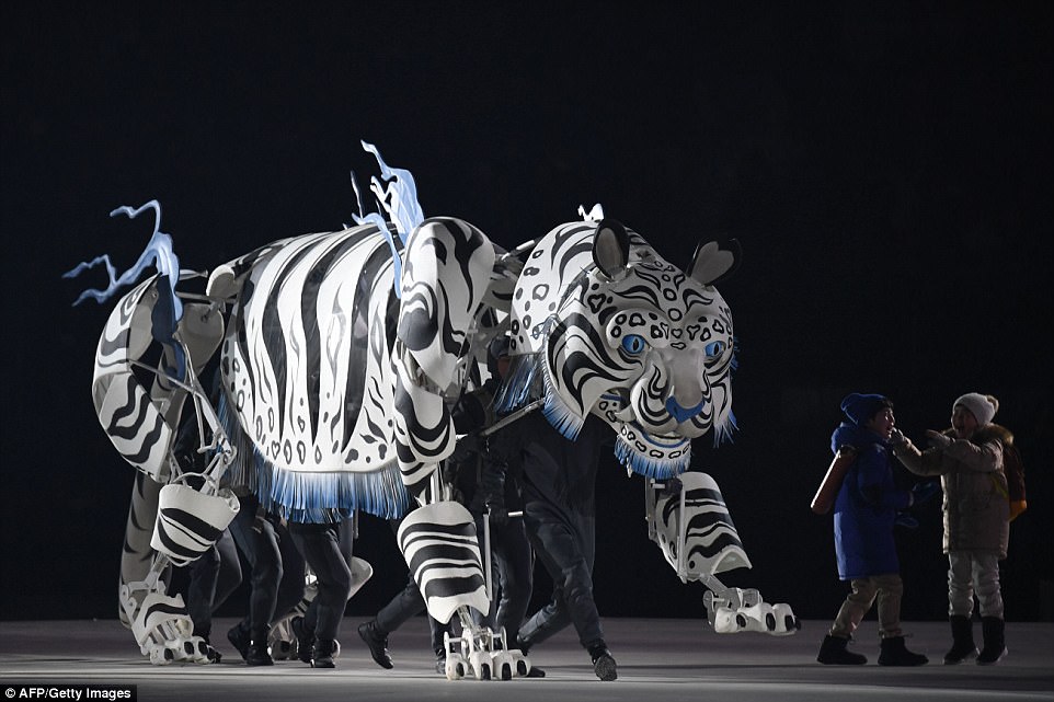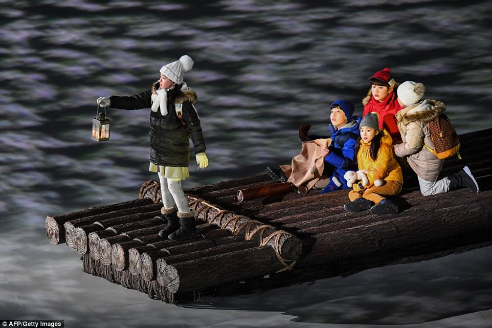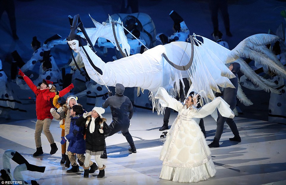 Hapja spektakolare u karakterizua nga fëmijë që performonin, kukulla gjigande, dhe mijëra kërcimtarë që festuan historinë dhe bashkimin e Koresë. Brenda një stadiumi me 30.000 njerëz, kishte edhe një skuadër me 200 kërcimtarë nga Koreja e Veriut, të cilët performuan në një temperaturë -3 gradë celsius, në përpjekje për ta mbajtur publikun ngrohtë.