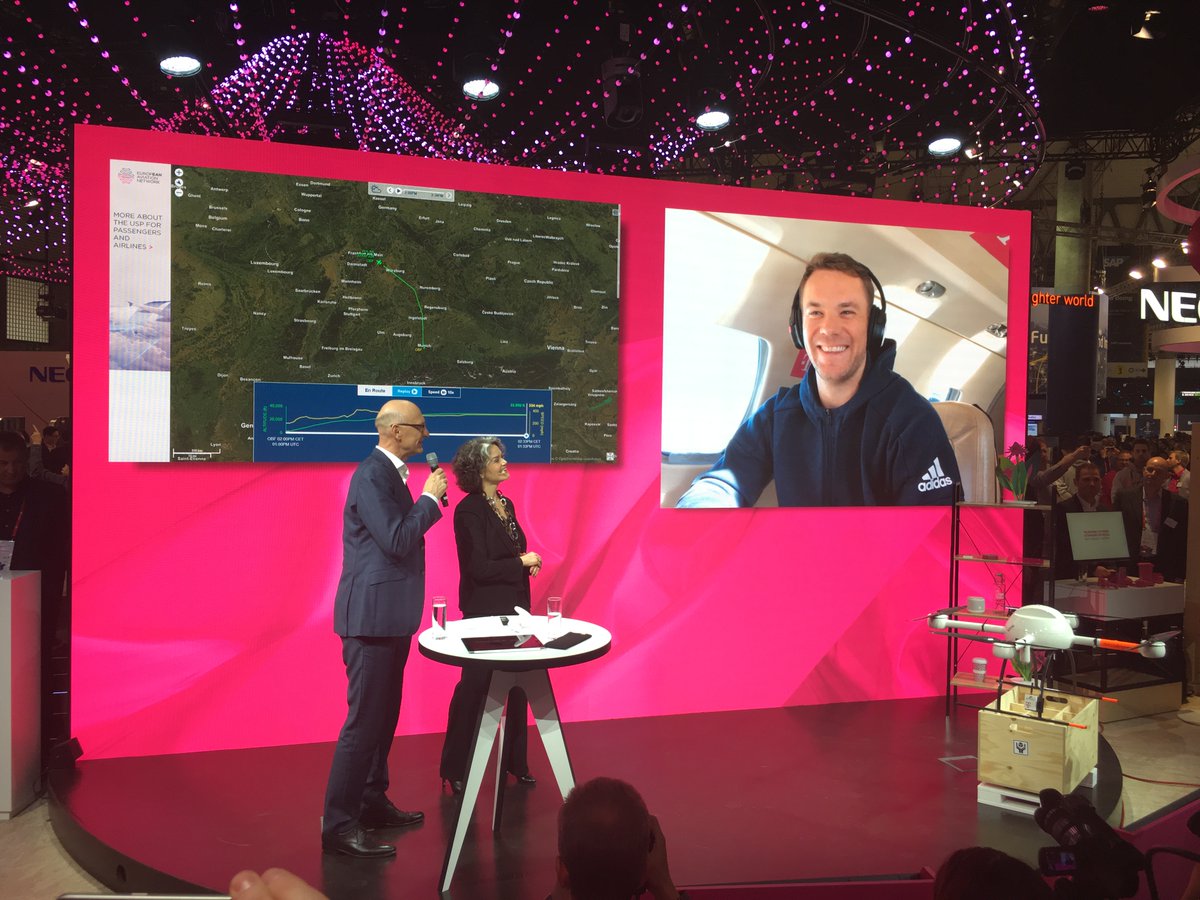 Drejtori i Deutsche Telekom Tim Höttges dhe portieri i Bayernit të Mynihut, Manual Neuner realizuan një lidhje të drejtpërdrejtë përmes Facetime. Realizimi i këtij komunikimi shënoi herën e parë të lidhjes përmes intrenetit LTE, mes reve dhe tokës. Neuer fluturonte mbi Franconia ndërsa Höttges ndodhej në panairin e Barcelonës, në stendën e Deutsche Telekom, i rrethuar nga gazetarë dhe vizitorë të panairit. Demostrimi live ishte provë e performancës dhe aftësive të rrjetit të ri të Deutsche Telekom, i cili është dizenjuar posaçërisht për t’u përdorur gjatë udhëtimit me avion. Rreth 300 antena LTE të vendosura në të gjithë Europën janë integruar duke përdorur teknologjitë e partnerëve të tjerë për të krijuar European Aviation Network (EAN), i cili ofron lidhje të shpejtë interneti në brez të gjerë për pasagjerët dhe linjat ajrore. Në fillim të shkurtit Deutsche Telekom lajmëroi se antenat LTE ishin testuar dhe ishin gati për të nisur punën.