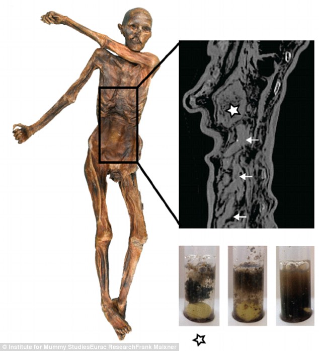 Mumja i është nënshtruar studimeve të stomakut ku është zbuluar dreka e fundit e njeriut të epokës së bakrit. Në stomakun e tij u konstatuan nivele të larta mbetjesh mishi të dhive të egra të kohës.