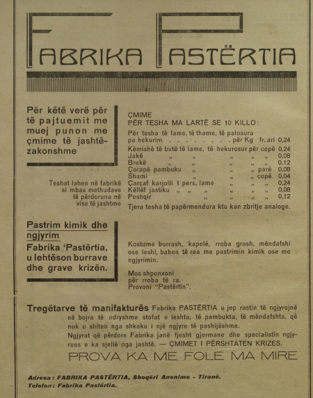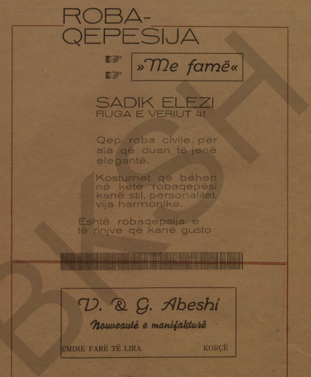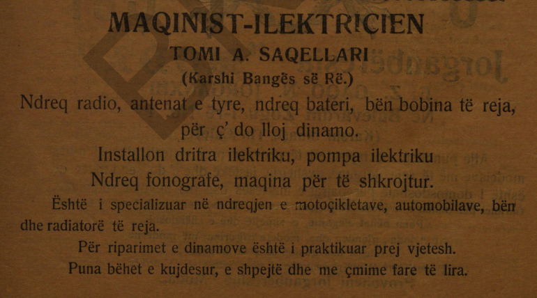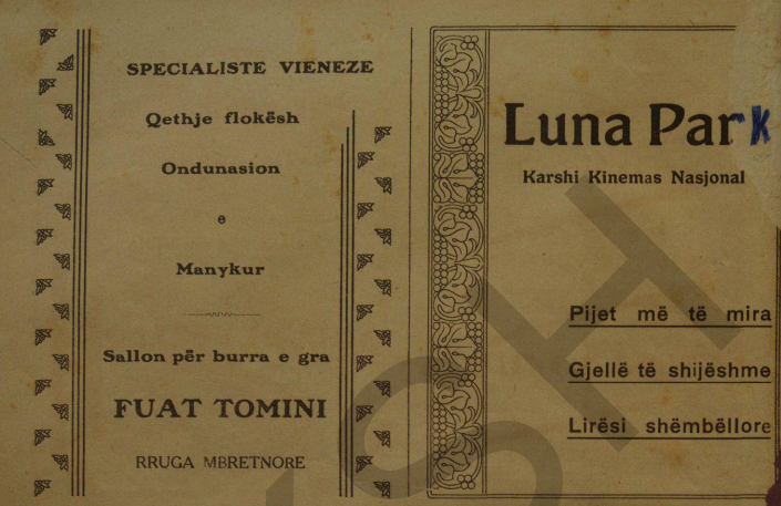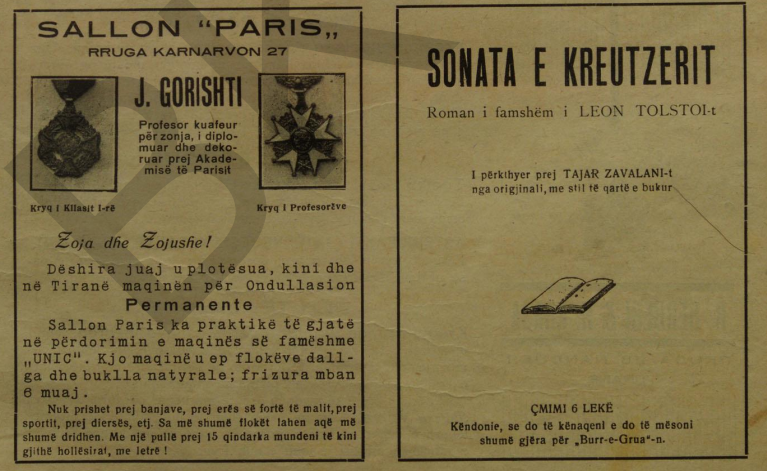 Parukeri: “Nëse doni që t’i kini të bukura flokët, jua siguron J.Gorishti. Dallgët dhe buklat natyrale jepen me anë të shpikjes shkencore më të re që është permanenteja UNIC”.