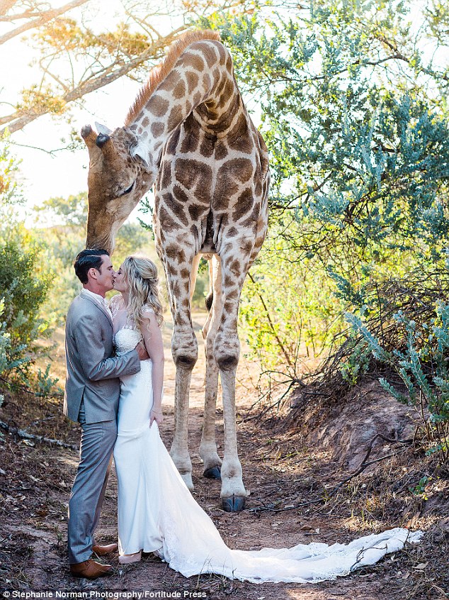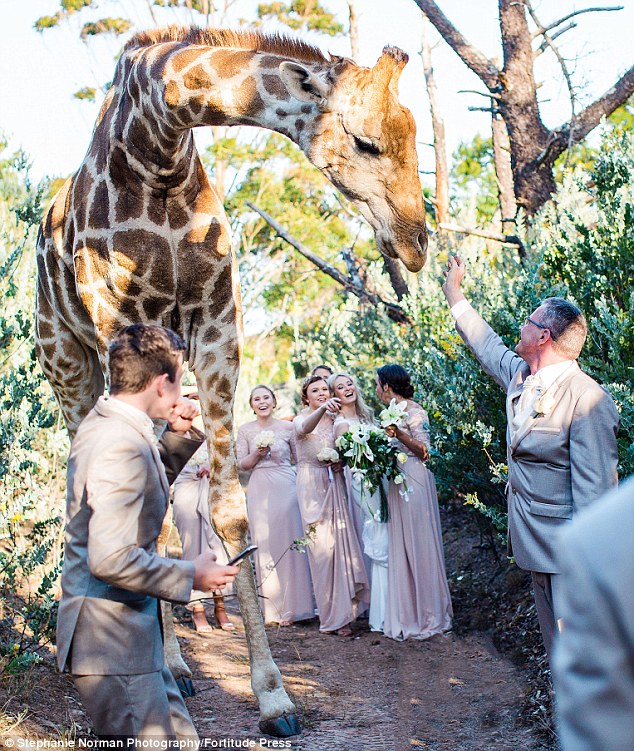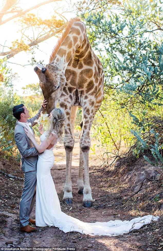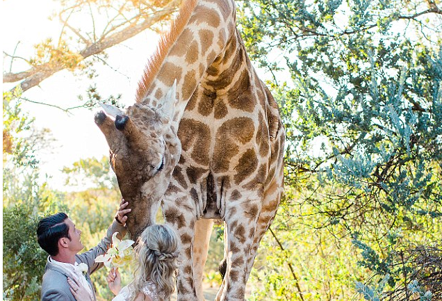 Një gjirafë erdhi në dasmën e Tristan Burns dhe Luke Karshagen ndërsa çifti po bënte fotografi në Areena Riverside Resort, në afërsi të East London në Afrikën e Jugut.