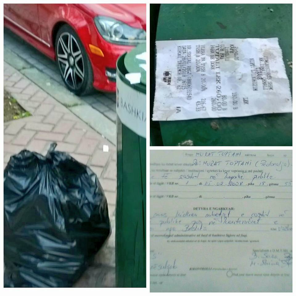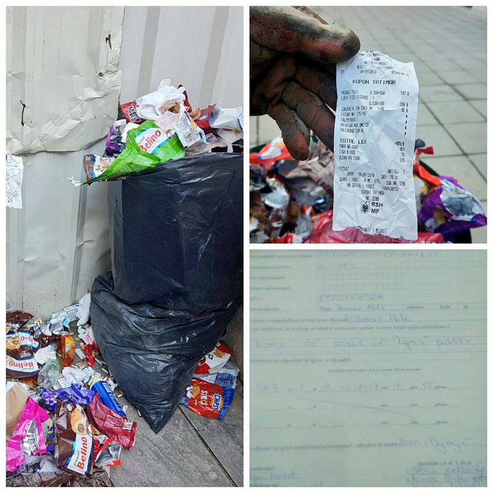 Kryetari i Bashkisë së Tiranës Erion Veliaj ka publikuar një prej rasteve ku inspektorët e kanë dokumentuar shkeljen përmes kuponëve tatimorë të gjetur në qesen e plehrave të hedhur në rrugë pranë lokalit. “ I love Tirona dhe prapëmbeturinat në rrugë?! Nuk tregohet dashuria dhe respekti për qytetin vetëm kur ka ndeshje! Por, derisa të sensibilizohen të gjithë, kujdesen kolegët për çdo ndotës”, shkruan Veliaj në Facebook.