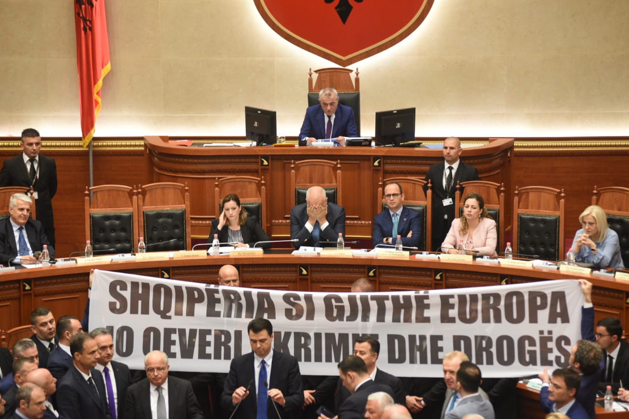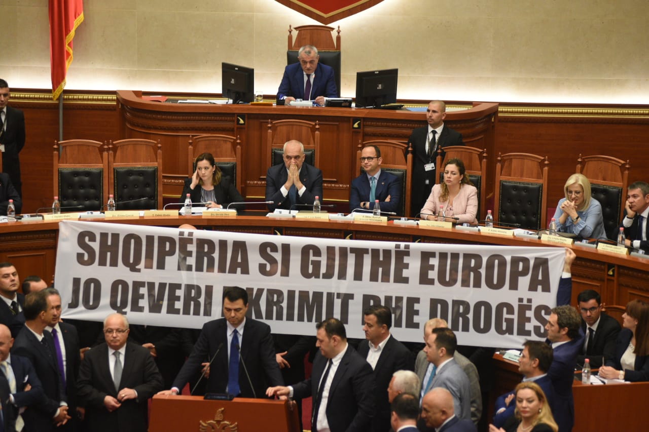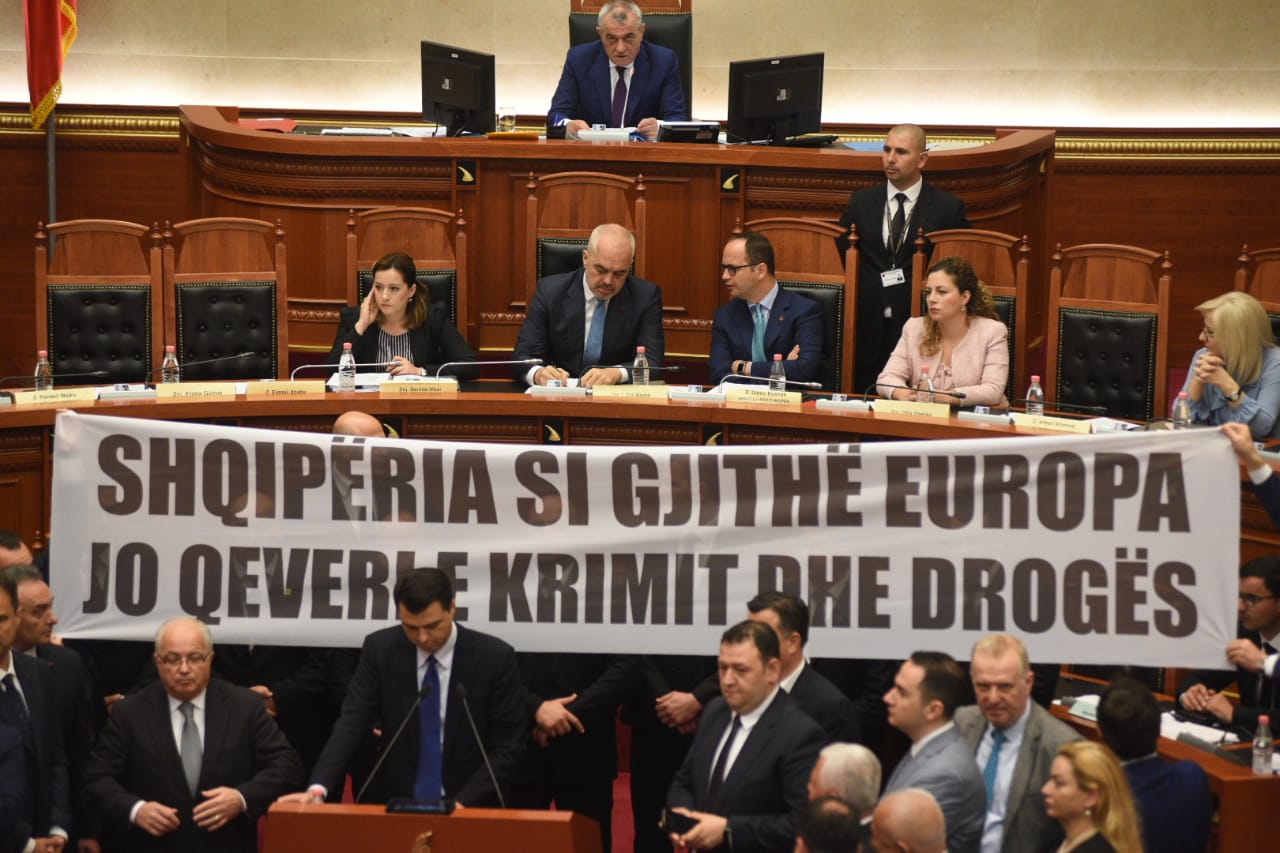 Lideri i selisë blu vijoi fjalimin në Facebok. Ndërkohë, deputetët e PD Klevis Balliu dhe Bardh Spahia mbanin në duar një parullë të madhe ku shkruhej “Shqiperia si gjithe Europa. Jo Qeveri e krimit dhe droges”.