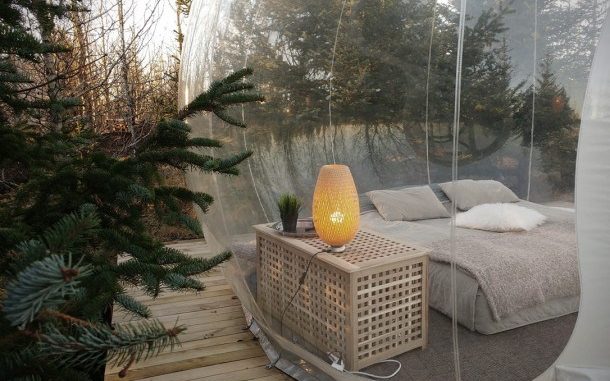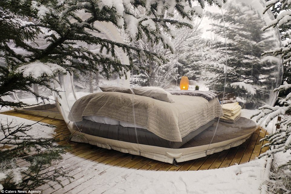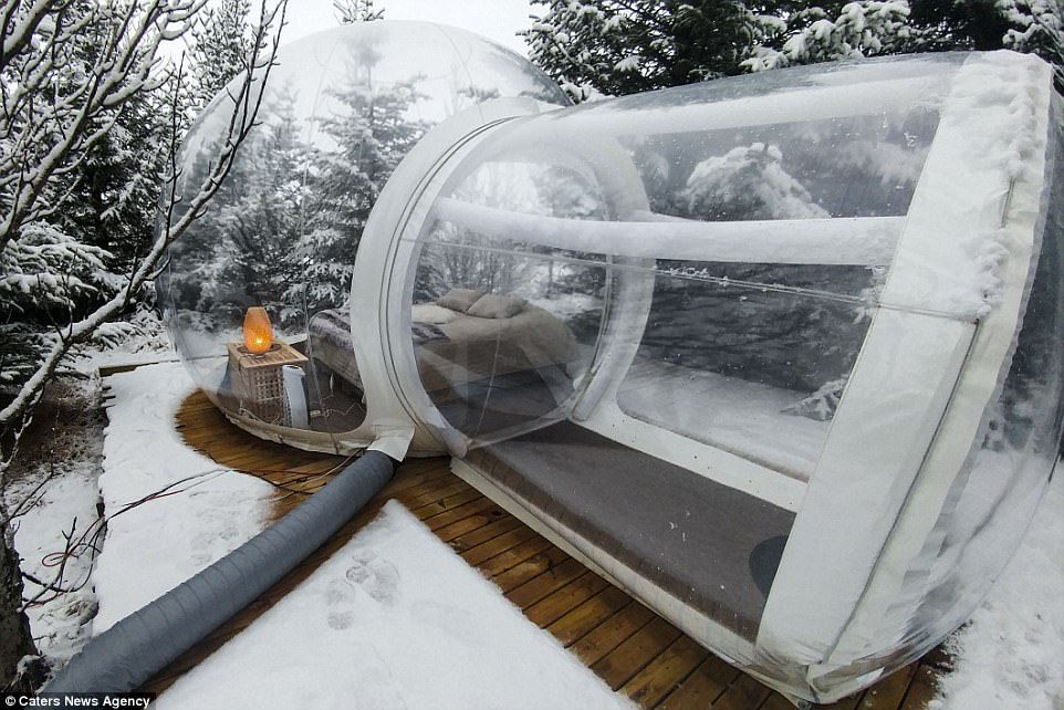 Pic by Caters News (PICTURED: The five million star bubble hotel pictured at night, nestled within the woodland.) – FORGET a five star rating when you are looking to book your holidays – this spot can boast that it is a five million star hotel. The Bubble in Iceland puts you smack back in the middle of nature with nothing between you and the stars but your rooms clear walls. And for a lucky few it provides unrivalled views of the Northern Lights. SEE CATERS COPY