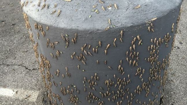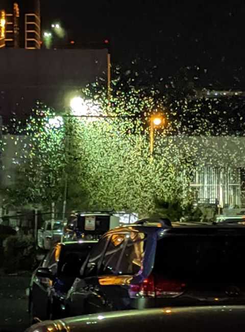 Video të postuara në mediet sociale shfaqin mizëri karkalecash, duke u ngjitur në shtyllat e ndritshme të neoneve. Gjithashtu trotuaret ishin mbuluar me insekte.
