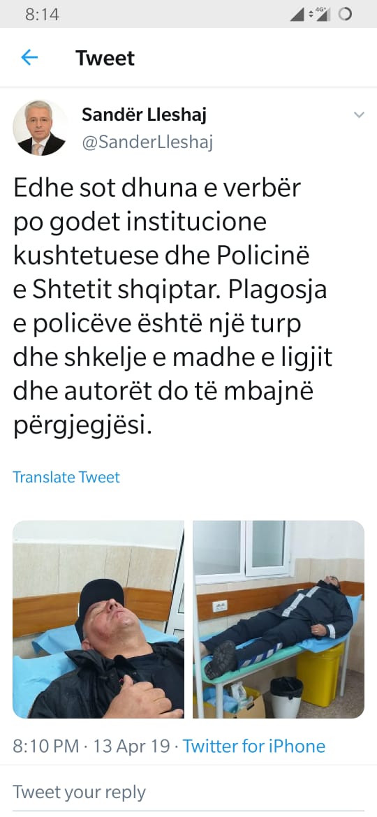 Pas akteve vandale të dhunës në protestën e PD- LSI ku 2 policë kanë mbetur të plagosur me djegie si pasojë e fishekzjarkryesorekryesorereve dhe flakadanëve të hedhur në drejtim të policisë, ka reaguar edhe ministri i Brendshëm Sandër Lleshi. Sipas tij, plagosja e policëve është një turp dhe shkelje e rëndë e ligjit dhe se personat përgjegjës do mbajnë përgjegjësi.