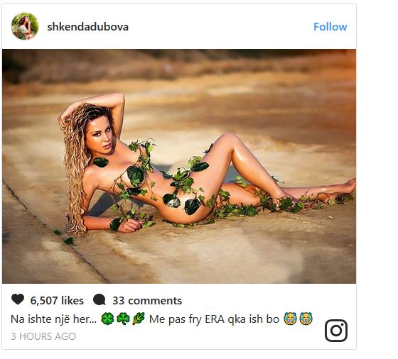 Një të tillë, Shkenda e ka publikuar së fundmi për ndjekësit e saj në rrjetin social Instagram. Ajo ka pozuar lakuriq, teksa ka mbuluar vetëm pjesët intime me gjethe.