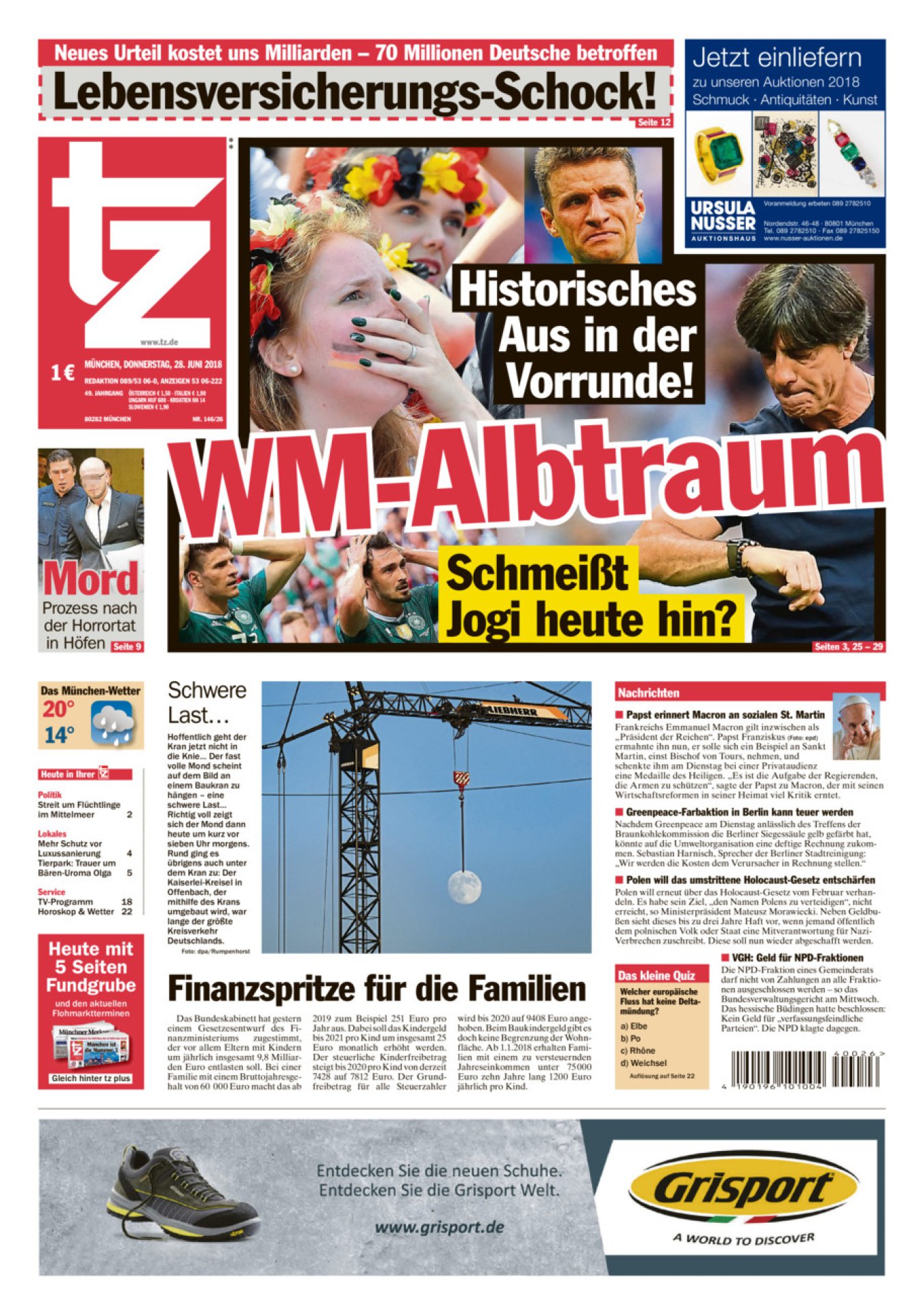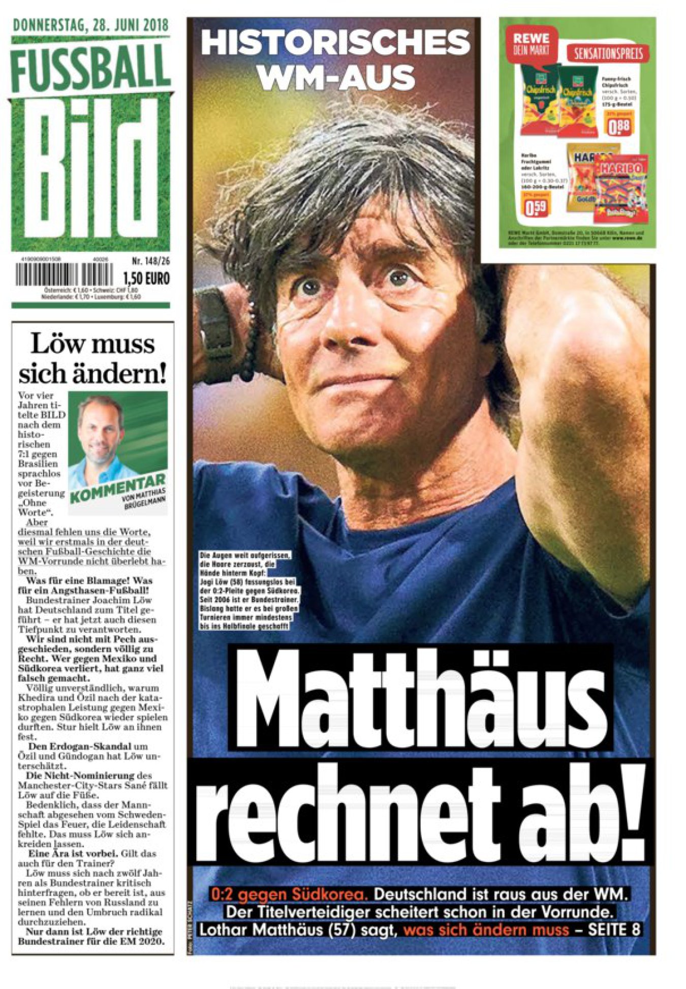 Ndërsa suplementi ‘Fussball Bild’ e zbraz të gjithë zemërimin te Joachim Loew për eliminimin historik nga Kupa e Botës – “Mattthaus të ndreqë llogaritë”. Revista ‘Kicker’ publikon foton me imazhin e trofeut të Botërorit në tokë që shoqëron artikullin me titullin ‘Eliminimi historik’.