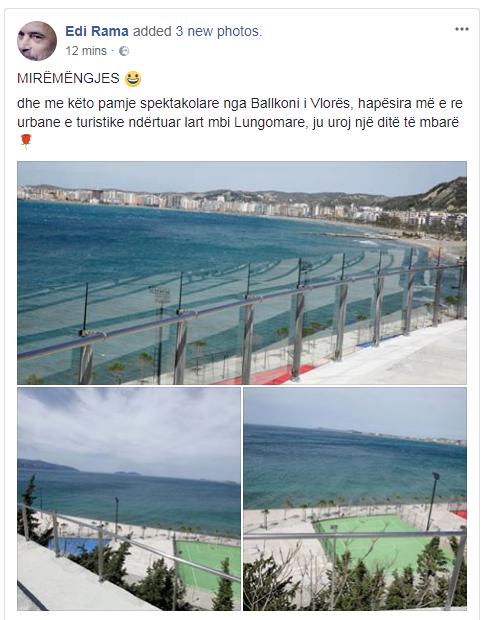 “Mirëmëngjesi dhe me këto pamje spektakolare nga Ballkoni i Vlorës, hapësira më e re urbane e turistike ndërtuar lart mbi Lungomare, ju uroj një ditë të mbarë”, shkruan ai.