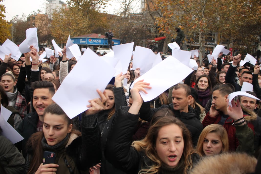 Disa nga studentet mbajnë në duar pankarta, ku nuk mungojnë edhe disa pikante.