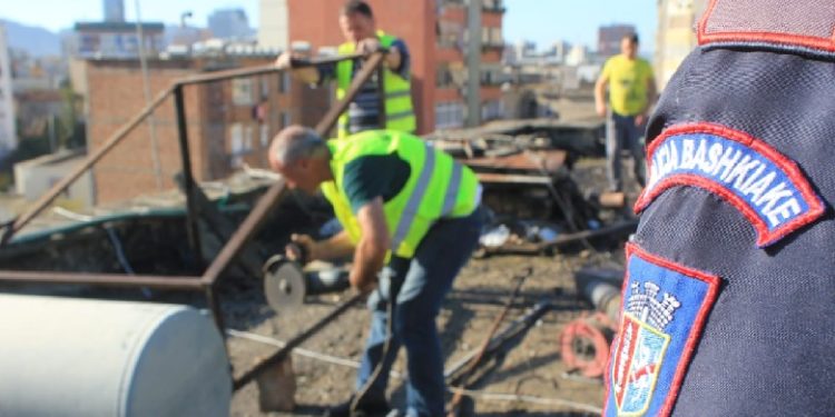 Punonjësit e institucioneve të Bashkisë së Tiranës, të ndihmuar nga efektivët e Policisë Bashkiake, që në orët e para të mëngjesit kanë nisur punën për heqjen e depozitave, të cilat për shkak të peshës, rrezikojnë seriozisht pallatet e dëmtuara rëndë nga tërmeti i 26 nëntorit.