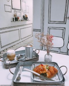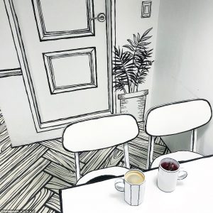 “Cafe Yeonnam-dong’” në Seul u hap vitin e kaluar dhe çdo gjë brenda nga dekori tek mobilimin deri tek enët janë me ngjyrë bardhë e zi, sikur një karikaturë.