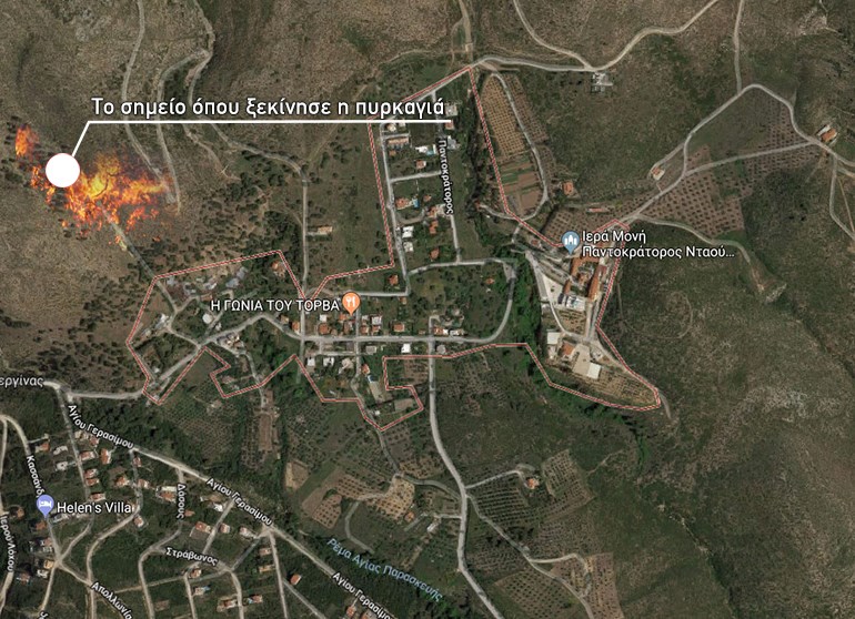 Zjarri, që deri tani ka marrë 81 jetë njerëzit, ndërsa qindra të tjerë vijojnë të jenë të zhdukur, dhe shkatërroi qindra shtëpi e makina në Attikën Juglindore, nisi të hënën pasdite nga Dao Penteli, disa kilometra larg nga Kallitechnoupolis.