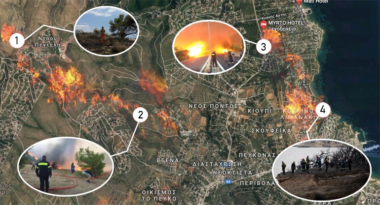 Për shkak të temperaturave të larta, erës së fortë dhe mungesës së ndërhyrjes, flakët gjigande u përhapën me shpejtësi, duke shkuar në Neo Voutza, deri në anën tjetër të Maratonës në Mati, kjo e fundit edhe zona më e goditur nga zjarri.
