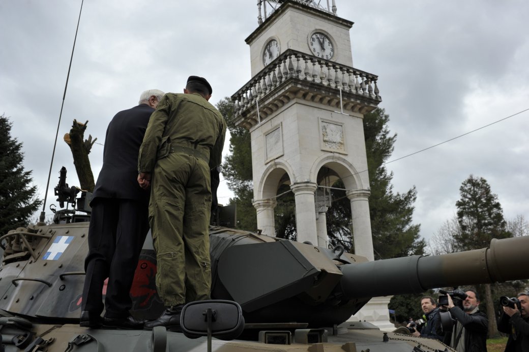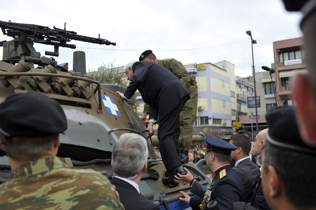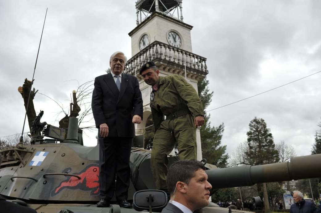 I ngjitur në majë të një tanku ushtarak, presidenti tha: “Ne grekët, populli dhe kombi i paqes dhe demokracisë, dimë si t’i mbrojmë kufijtë tanë, integritetin tonë territorial dhe sovranitetin tonë kombëtar” .