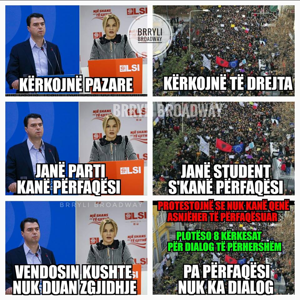 Studentët, gjimnazistët dhe qytetarë kanë vijuar protestën para kryeministrisë dhe kërkojnë plotësimin e kërkesave të depozituara te kryeministri Edi Rama. Ndërkohë, rrjetet socilale kanë ironizuar politikën që përpiqet të fitojë kredite përmes saj. Më poshtë po përcjellim disa nga memet më pikante që kanë qarkulluar në rrjet./a.meta
