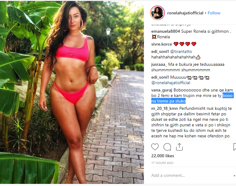 “Unë publikoj foto për qejfin tim pa asnjë kompleks me dëshirë shumë të madhe dhe më shmë inat më vjen se komentet negative vijnë nga persona që në Instagram kanë zero foto dhe zero njerëz që i ndjekin, kjo tregon sa të bukur janë vetë. E gjithashtu habitem se shumica prej tyre janë femra që shajnë femrat me komente të shpifura sepse ato komente ashtu janë të shpifura. Gjithsesi vajza hipini të dashurëve dhe nxirreni inatin dikur tjetër”, ka përfunduar Ronela e cila me vonë i ka fshirë Instastoryt.(TemA)