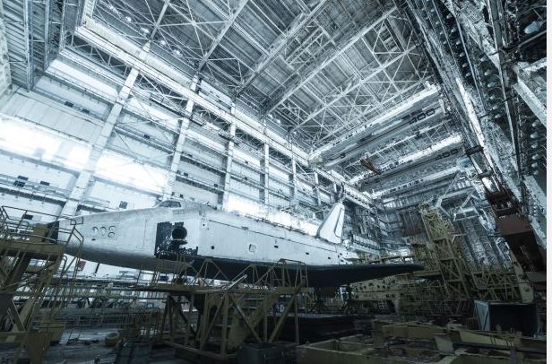 Ajo ndodhet në një hapësirë të shkretë, në stepën e Kazakistanit rreth 1500 milje larg nga Moska. Ajo qëndron në një hangar jo shumë larg aerodormit kur anija bëri fluturimin e parë dhe të vetëm gjatë Luftës së Ftohtë.