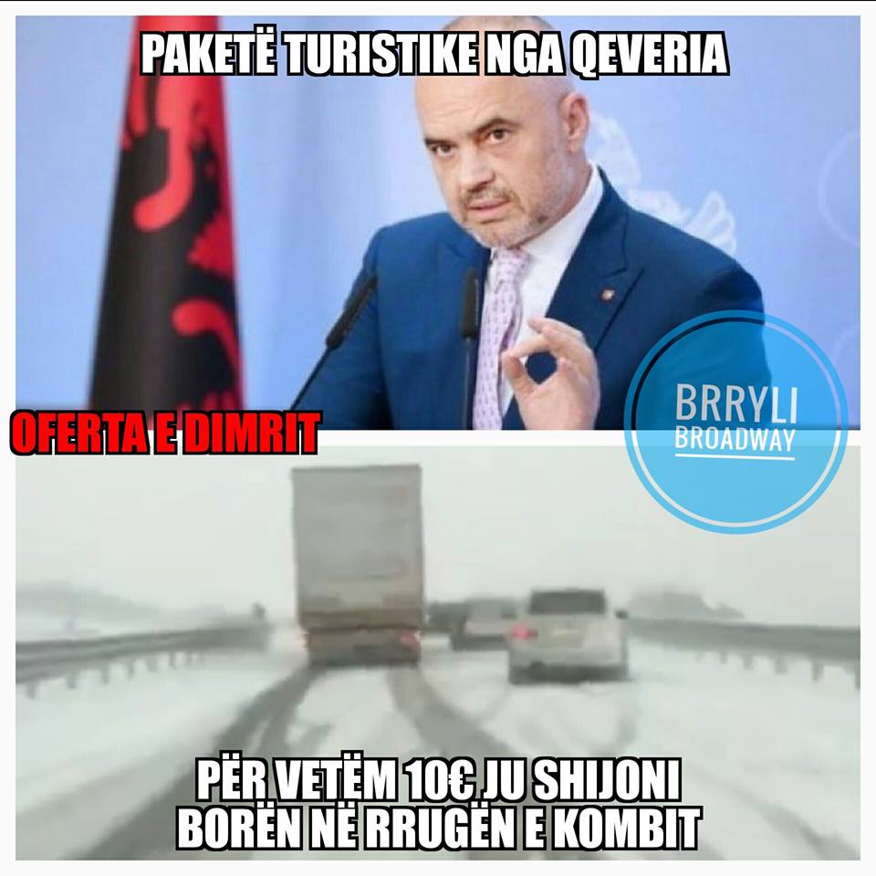 Shqipëria që prej dje është mbuluar nga bora. Disa prej rrugëve janë të bllokuara, ndërkohë që kryeministri Edi Rama thotë se të gjitha strukturat e shtetit janë në dispozicion për të zgjidhur situatën. Por në rrjet nuk mendojnë kështu, që ironizojnë aktualitetin në vend me disa meme pikante./a.meta