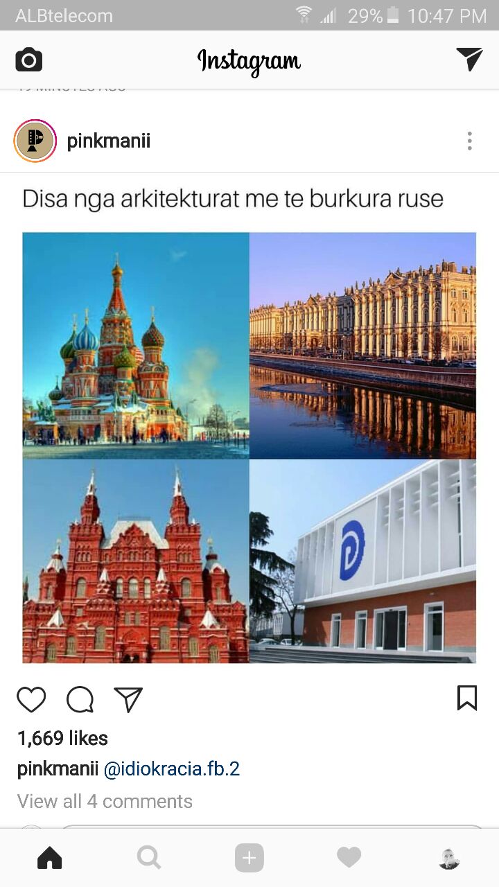Këto të fundit vijojnë të ironizojnë Bashën ku në katër foto të publikuara paraqiten ndërtesa të Moskës bashkangjitur edhe selia e Partisë Demokratike me dixhiturën ironizuese: “Arkitekturë e bukur ruse”.