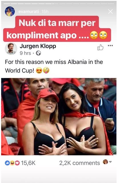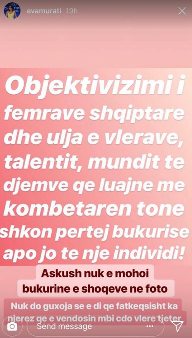 Këtë koment krah fotos që bëri xhiron e rrjetit botërorin e katër viteve më parë, thumboi dhe moderatorja sportive Eva Murati. Kjo e fundit, nuk zgjodhi heshtjen si përgjigje, por vendosi pikat mbi i sipas mënyrës së vet. Kështu, Eva në mesazhin e saj të fundit të postura në instastory thotë: “Objektivizimi i femrave shqiptare dhe ulja e vlerave,talentit, mundit të djemve që luajnë me kombëtaren tonë shkon përtej bukurisë apo jo të individit. Askush nuk e mohoi bukurinë e shoqeve në foto. Nuk do guxoja se e di që fatkeqësisht ka njerëz që e vendosin mbi çdo vlerë tjetër”. /ma.me