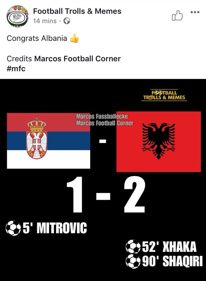 Rrjetet sociale që prej mbrëmjes së djeshme janë mbushur me foto dhe statuse për Xhakën dhe Shaqirin, që me dy golat e tyre në mes të Rusisë, mundën Serbinë, duke e nxjerrë me shumë mundësi jashtë Botërorit. Fakti që serbët humbën me golat e dy shqiptarëve, ka bërë që të ketë shumë ironi. Kjo, pasi serbëve iu ka djegur shumë, por dhe një pjesë e zvicerianëve nuk janë ndjerë mirë, për festimin me “shqiponjë” të Xhakës e Shaqirit. /ma.me