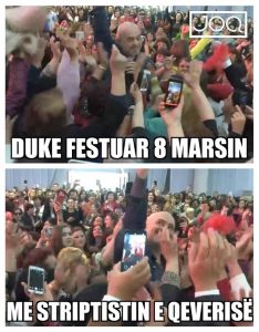 Kryeministri Edi Rama zhvilloi një takim me gratë në Fier me rastin e festës së 8 Marsit. Shefi i qeverisë ka ftuar gratë dhe vajzat që të bashkohen me të dhe të kërcejnë. Pas ftesës që bëri, Rama për një moment e pa veten të rrethuar. Ndërkohë, kjo shfaqje nuk është lënë jashtë vëmendjes së faqeve të njohura të humorit në rrjetet sociale.