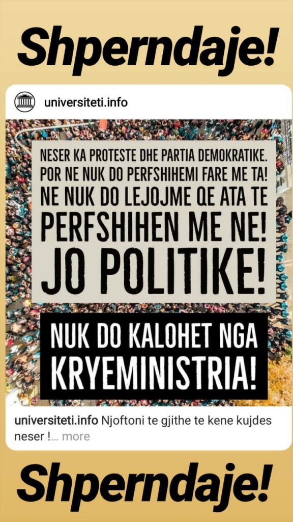 “Nesër ka protestë edhe Partia Demokratike. Por ne nuk do të përfshihemi fare me ta! Ne nuk do lejojmë që ata të përfshihen me ne. Jo politikë! Nuk do kalohet nga kryeministria”, thuhet në njoftimin e tyre. /a.meta