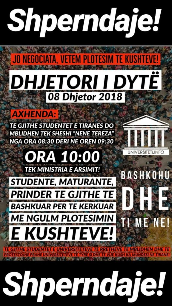 Studentët do të vijojnë edhe nesër protestën e tyre para Ministrisë së Arsimit. Por, ditën e nesërme me rastin e 8 dhjetorit, pritet që edhe PD të organizojë një protest. Për këtë arsye, organizatorët e protestës së studentëve kanë kërkuar nga ana e këtyre të fundit, që askush prej tyre të mos i bashkohet protestës së PD-së. Ata ndërkohë, kanë kërkuar nga PD që të mos tentojë të bashkohet me protestën e tyre, pasi nuk do të lejohet asnjë parti që ta politizojë atë.