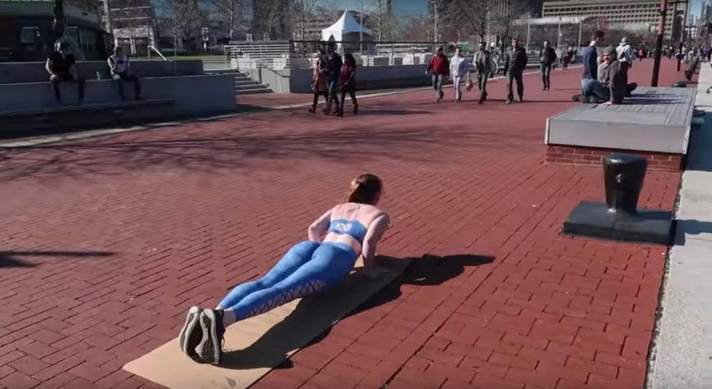 Një vajzë e zhveshur e gjitha, vetëm me mbathje fare të vogla në trup, nisi të bëjë stërvitje në mes të rrugës, por askush nuk e vuri re.