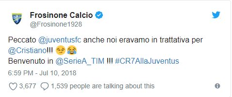 Dëshirës për të komentuar këtë kalim të CR7 te ‘zonja e vjetër’ nuk i ka rezistuar as Frosinone, klubi italian që me anë të një postimi në rrjetet sociale i ka bërë të gjithë të qeshin.